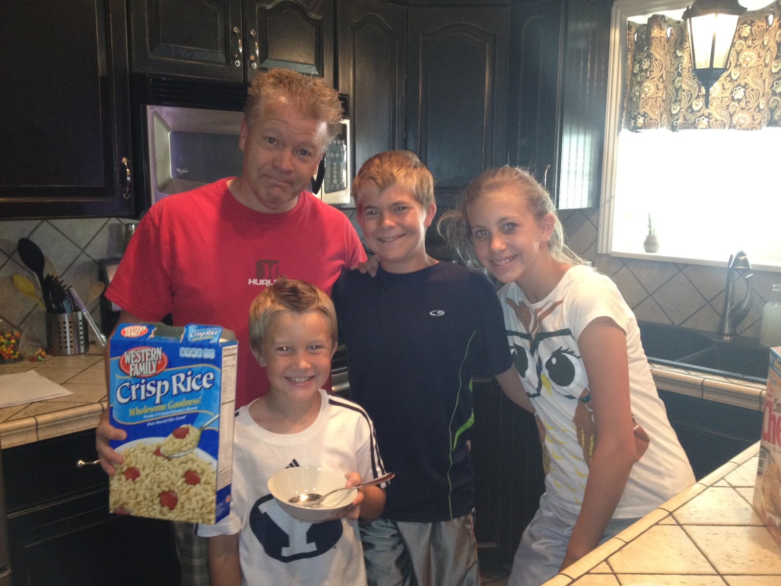 On Father's Day it is a tradition to make something indescribably delicious for breakfast. This year, we decided to see how Aaron would react if we served him generic Rice Krispies instead of the usual yumminess!